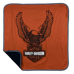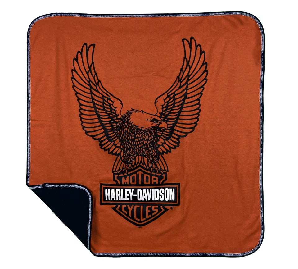He's finally here, and you simply can't put him down. Wrap him in the majestic embrace of the H-D® Newborn' Receiving Blanket and welcome your new generation into the extended Harley® family. Made from all natural cotton, this reversible blanket features a screen printed graphic on the orange side along with the solid black color on the other. Your heart will soar like the upwinged eagle as it lifts from the top of the iconic Bar & Shield® logo. Sized just right to swaddle your newborn. Orange/Black. Cotton. SGI Apparel