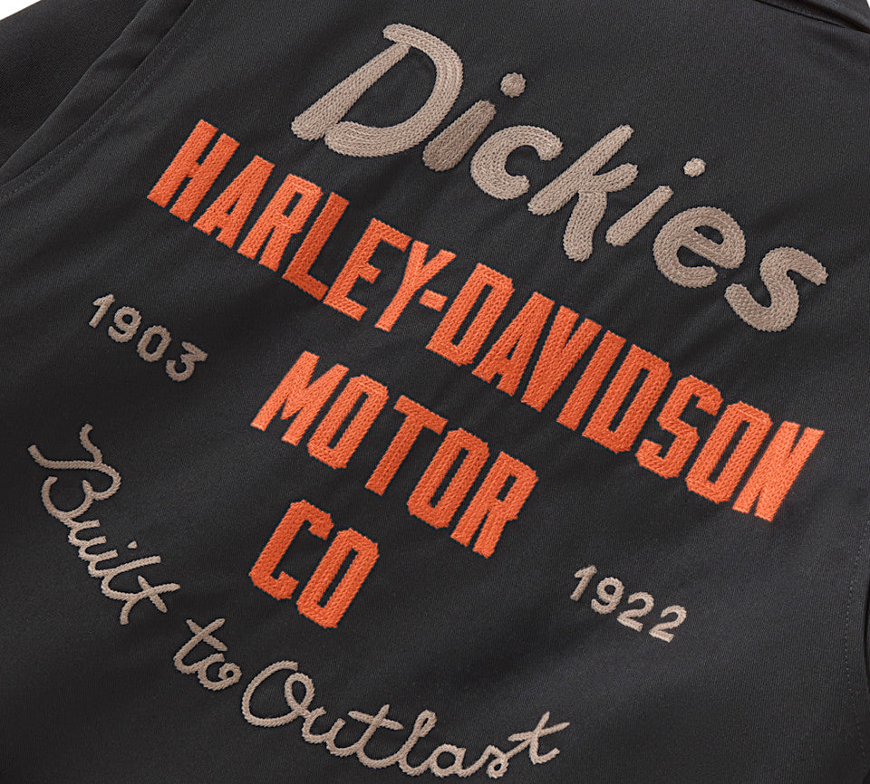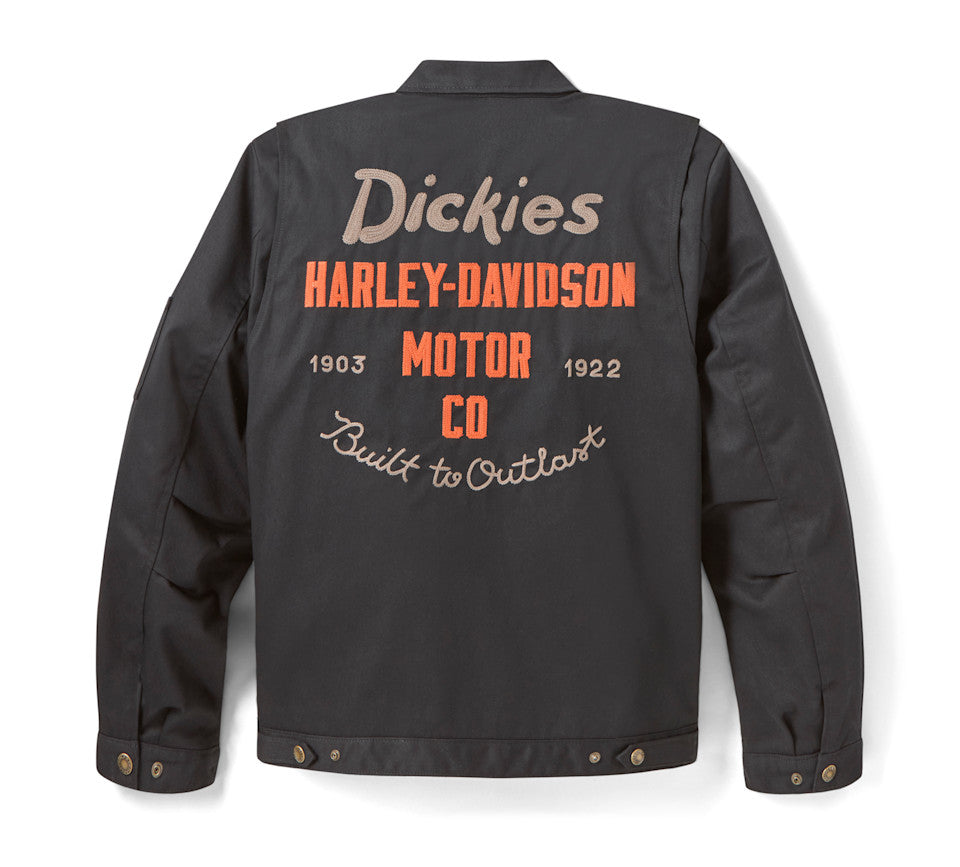Style steeped in resilience and a free spirit is here on the Dickies x H-D® Quilted Lined Eisenhower Jacket. It’s ruggedly made from a heavyweight recycled twill blend and insulated for added warmth. A retooled version of the beloved Dickies® silhouette, it features an action back, pre-curved sleeves, two-way zip front, a D-ring utility loop on the inside chest pocket, and a hidden snap-down collar that won’t flap around under riding gear. This unisex outerwear is finished with a montage of custom graphics that commemorate the inception date and longevity of these two iconic brands. Part of the latest Dickies x H-D® special assortment of apparel that honors the unwavering, get-it-done spirit of riders and workers from all walks of life.
