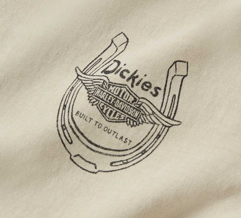 Throwback style syncs with longwearing comfort on the Dickies x H-D® Vintage Cowgirl Boxy Fit Tee. This women’s t-shirt is made breathable from all-cotton jersey in a boxy fit. Its heavy pigment wash gives it a unique color and shading variation, as well as a distressed look to the printed artwork. The front features the iconic Dickies horseshoe and the Harley-Davidson 1930s Silver Wing logo, while the custom scene on back is inspired by stunt riding and horsepower. Part of the latest Dickies x H-D® special assortment of apparel that honors the unwavering, get-it-done spirit of riders and workers from all walks of life.