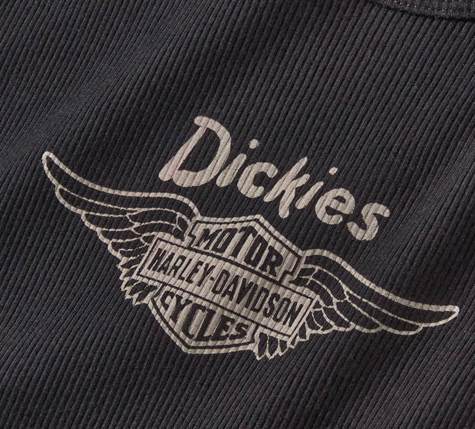 Staying cool is as easy as looking cool in the Dickies x H-D® Winged Bar & Shield Ribbed Tank. Its slightly cropped silhouette sits at or just above the waistline, and is crafted from breathable 100% cotton that’s ribbed for a textured look. Hit on front with signature Dickies branding plus the Harley-Davidson 1930s Silver Wing logo. Part of the latest Dickies x H-D® special assortment of apparel that honors the unwavering, get-it-done spirit of riders and workers from all walks of life.