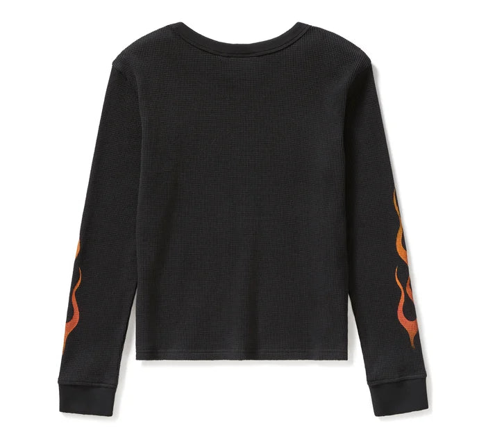 Add a layer of fiery H-D style with our Vintage Flames Knit Top. It’s made from a thermal cotton/polyester blend that’s enzyme and softener washed for worn-in look and feel. This women’s long sleeve crew neck is finished with gradient flame graphics on front and searing up the sleeves.