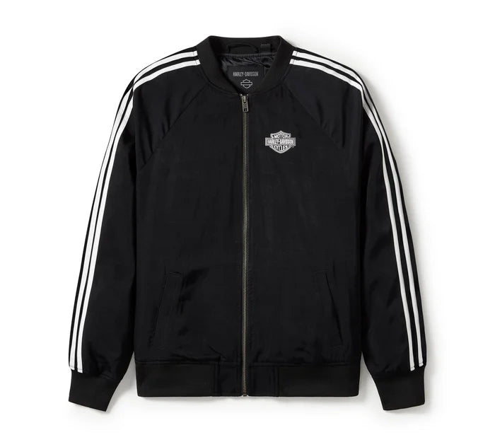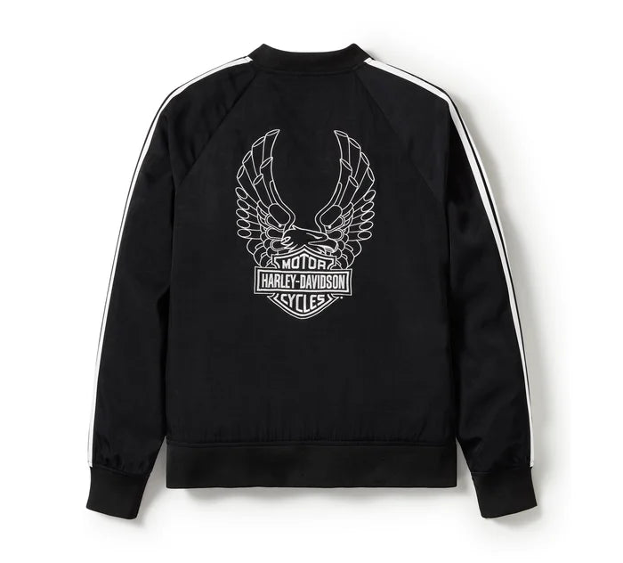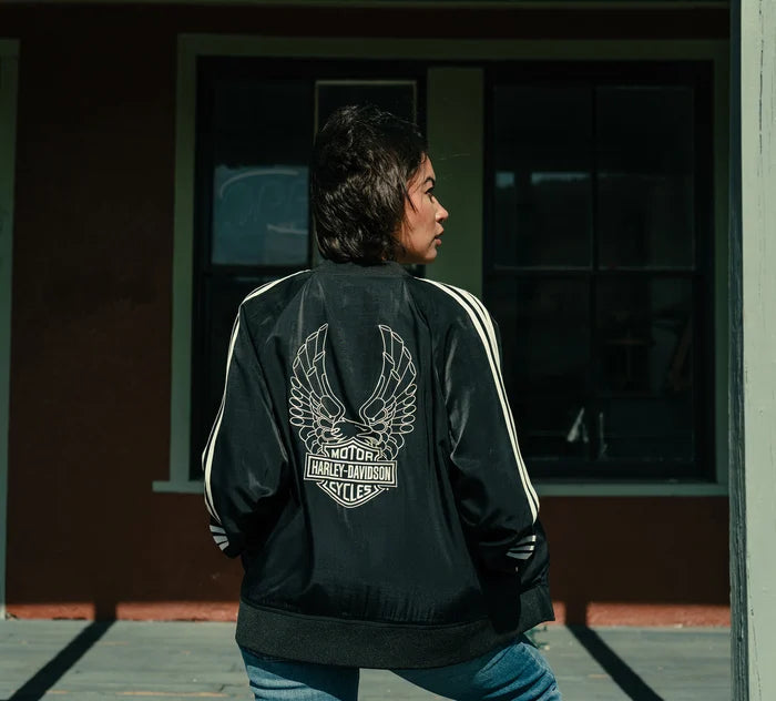 We gave a classic silhouette an H-D revamp on the Freedom Eagle Bomber Jacket. Its relaxed fit is made from lightweight yet rugged polyester/rayon twill for a silky hand feel that’s wrinkle resistant. This women’s outerwear features top-applied sleeve striping for a hit of contrast, and rib knitting for added durability and stretch. Finished with embroidered graphics gracing the front and going all-in on back. Zoom closer to see that the eagle’s wings on back resemble exhaust pipes—proof that nothing goes better together than soaring freedom and the open road.