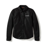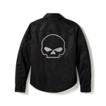 Legendary artistry meets breathable, lightweight protection in our Willie G® Skull Graphic Mesh Operative Riding Shirt Jacket. Its allover knit mesh construction welcomes more airflow than our previous Operative twill styles. It has reflective material to enhance visibility, a hidden snap-down collar that won’t flap around during rides, and is equipped with superior impact protection from our D3O® Ghost™ armor at the shoulders and elbows. This women’s motorcycle shirt jacket is also tested and certified to meet abrasion, tear, and seam strength requirements (more details below). It’s minimally branded on front to make room for Willie G. Davidson’s most iconic logo on back. Know the history—in addition to his artwork used on H-D® apparel, Willie G. personally designed several motorcycles, including the 1971 FX Super Glide® and the 1977 FXS Low Rider®.