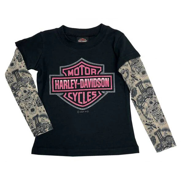 Harley-Davidson Little Girls' Glitter B&S Mesh Tattoo Long Sleeve Tee