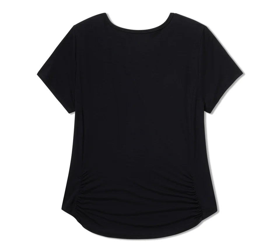 Princess seam ruching. Slight cap sleeves. Rounded hem.