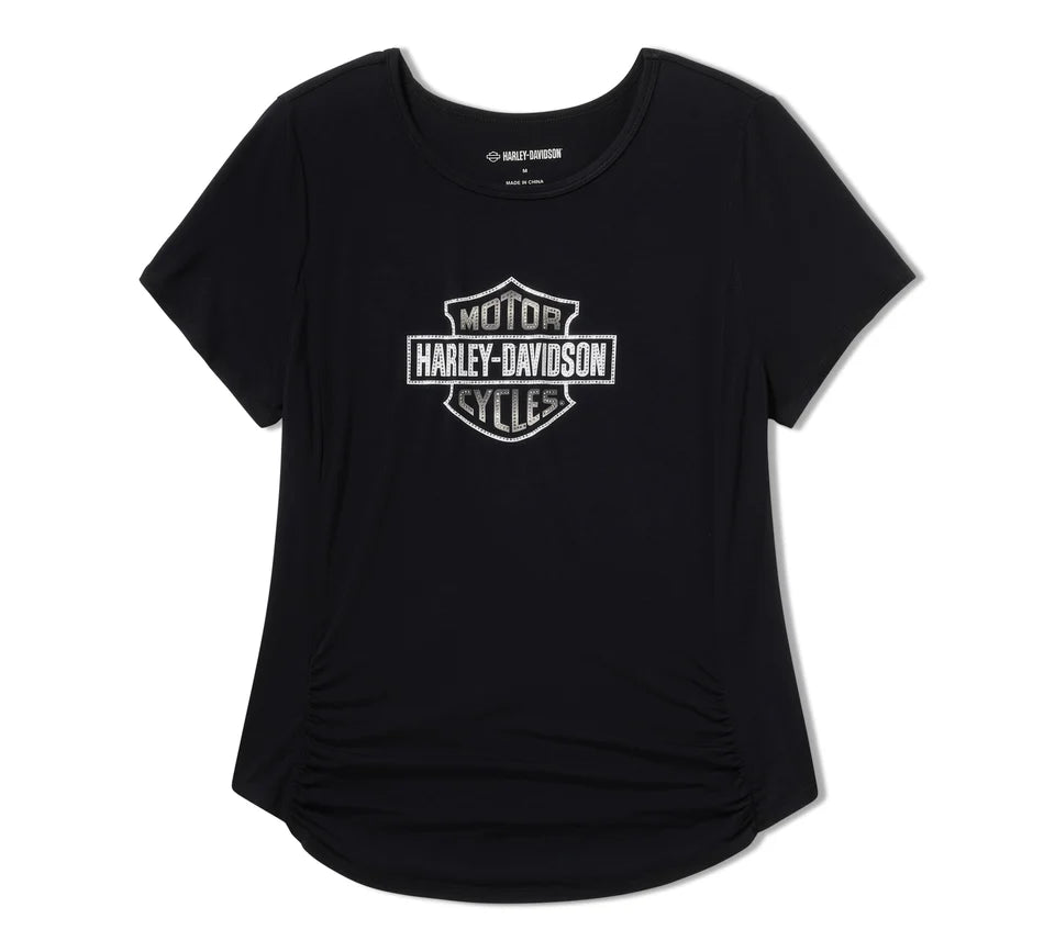 Add some shimmer to your timeless H-D look with our Beveled Bar & Shield Bling Top. It’s crafted for longwearing comfort from super soft rayon jersey with a hit of spandex for added stretch. This women’s top features slight cap sleeves, plus princess seam ruching and a rounded hem to flatter your shape. It’s finished with our most iconic logo drenched in rhinestones.