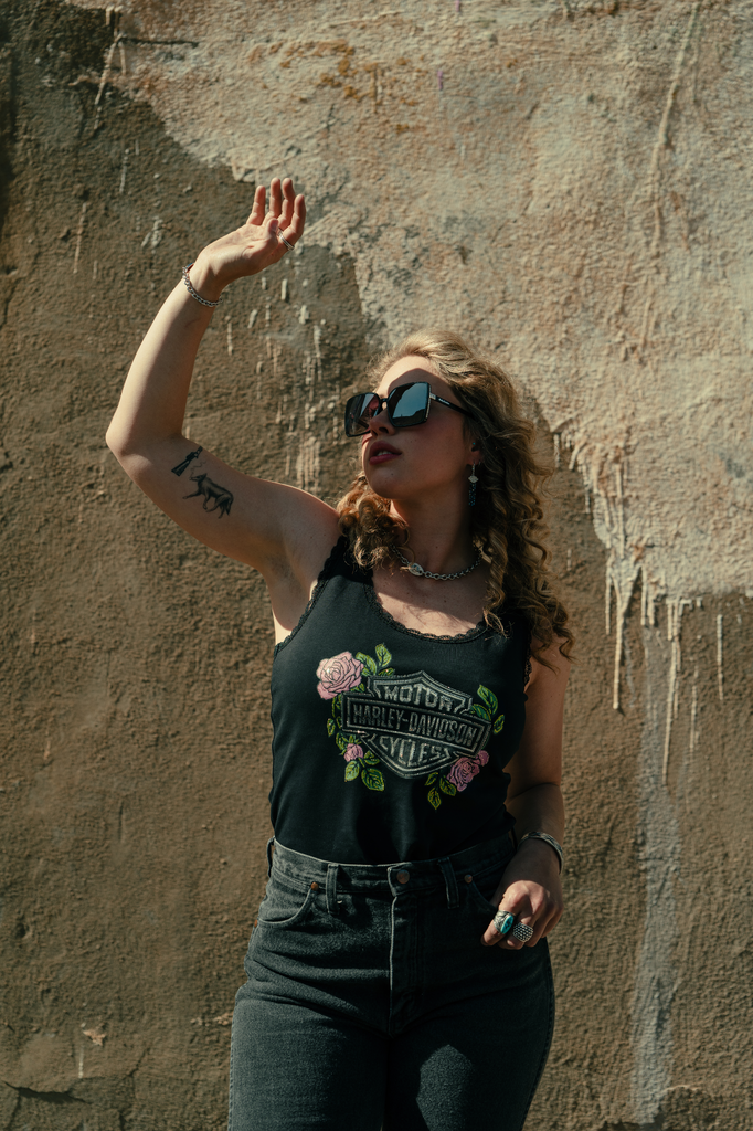 Flattering, floral style is retooled for Harley fans on our limited-issue Rose & Thorn Bling Lace Trim Tank. Its slim-fitting silhouette is crafted from durable yet breathable cotton interlock with a hit spandex for added stretch. This women’s tank top takes a stylish detour with its lace trim and embellished graphics that fuse our moto legacy with blooming roses. Snag yours while supplies last.