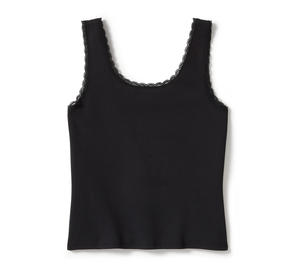 • Design Details: Slim-fitting silhouette. Front and back scoop neckline. Lace trim.
