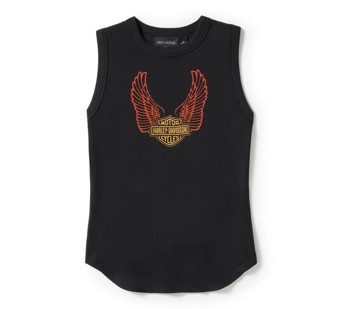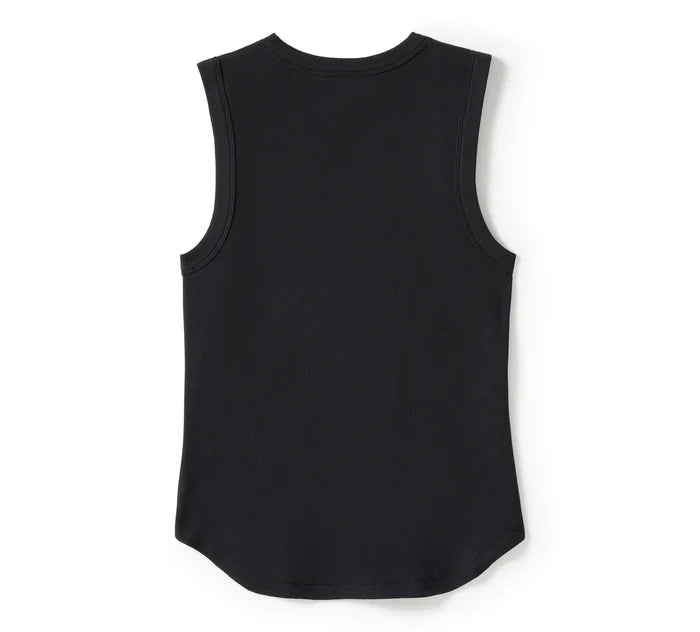The soaring freedom of the open road is calling on the Chrome Eagle Ribbed Tank. Crafted for stay-cool comfort from a cotton/modal blend with a hit of spandex for added stretch that’s all ribbed for a textured look. This women’s tank top sports a high, crew neckline and wide binding. Its throwback design on front is inspired by graphics sourced from our archives.