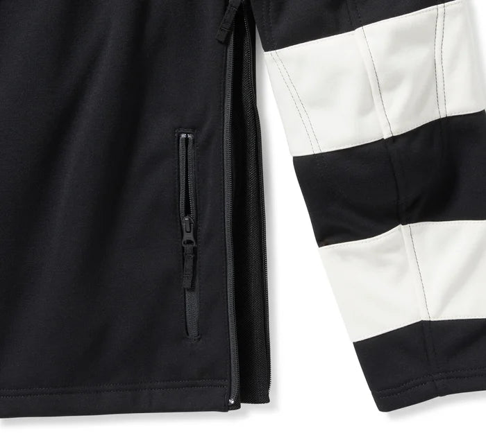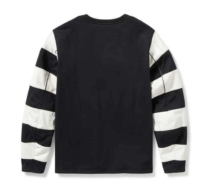 Race-inspired style synchs with enhanced riding protection in our latest H-D® Breakout Deflector Crew Riding Fleece. Its wisely engineered design is windproof and loaded with features like air-loving vents, reflective material to enhance visibility, and a lower back pocket for securing essentials. Built from heavyweight bonded fleece, it includes D3O® Ghost™ armor in the shoulders and elbows for impact protection. This men’s motorcycling crewneck is also tested and certified to meet abrasion, tear, and seam strength requirements. It’s finished with yarn-dyed sleeve striping and felt patch graphics inspired by our 1920s racing team jerseys. Get familiar with all its specs below, then order yours now.