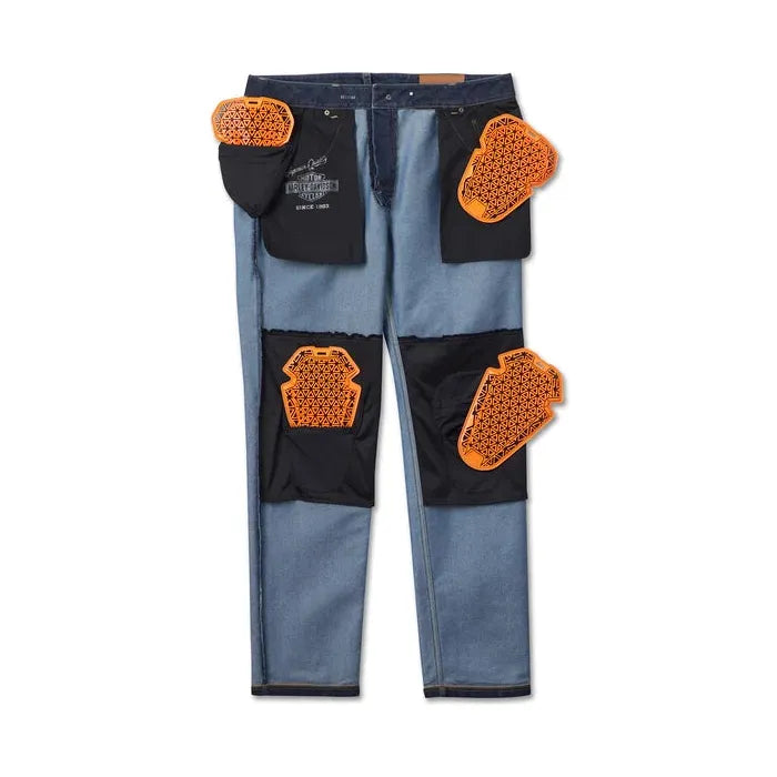 Classic denim style meets impact protection in our latest riding pants. Made abrasion-resistant from a heavyweight material blend, our Harley-Davidson Straight Riding Denim delivers a slimmer fit through the hip and thigh with traditional five-pocket jean styling. The D30 Ghost armor at the hips and knees plus reflective material to boost visibility make these men’s motorcycling pants a sensible choice for riding. The branding stays clean so you can pair them with any H-D riding jacket or shirt you own.
