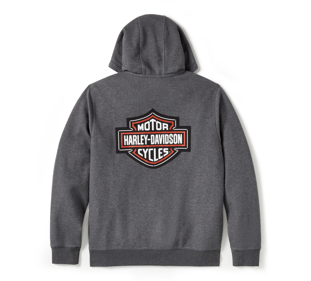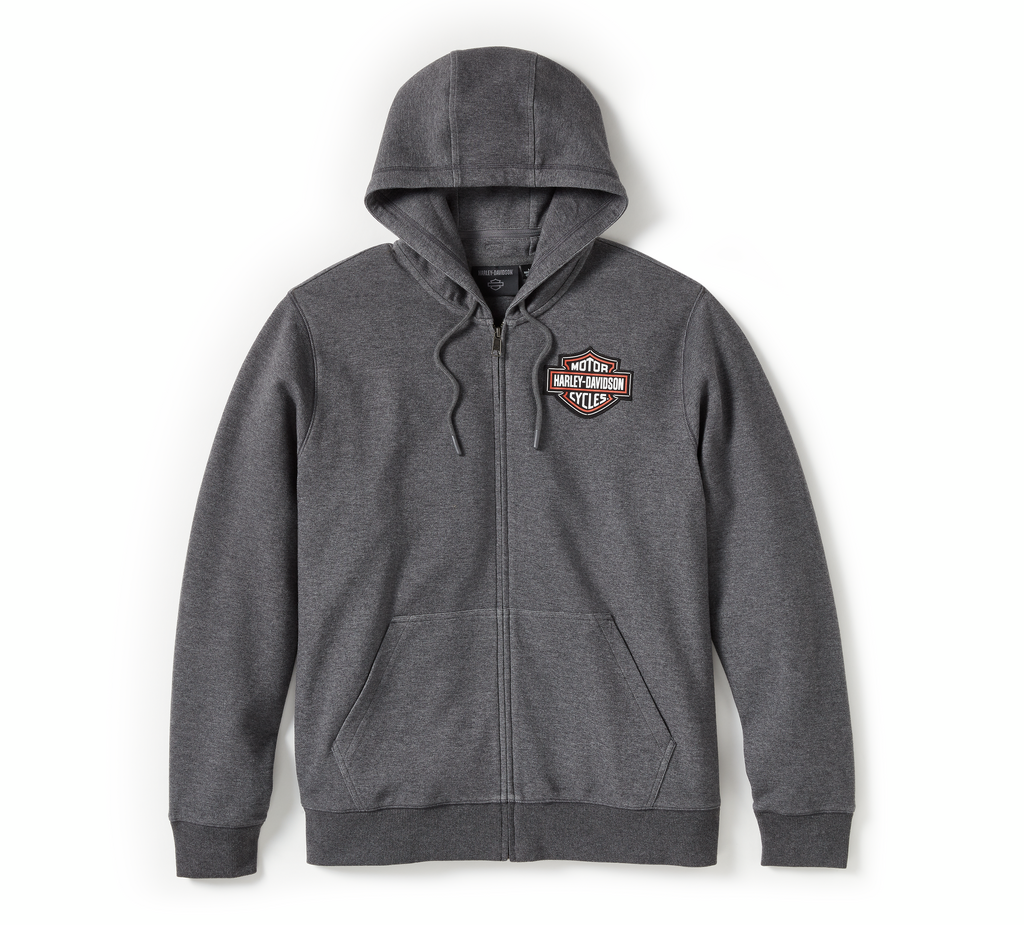 Timeless H-D style takes a practical route with our Bar & Shield Balaclava Hoodie. It’s cut from a heavyweight interlock blend that’s extremely soft yet firm and absorbent in a relaxed fit. This men’s zip front hoodie features a stowaway balaclava for added warmth when temps dip. Style wise, it’s finished with our most iconic graphic patched on the front and back, plus our namesake riding down the balaclava.