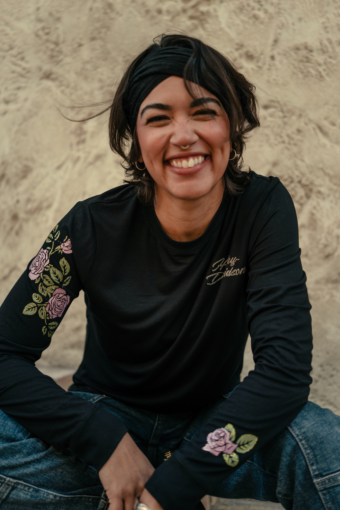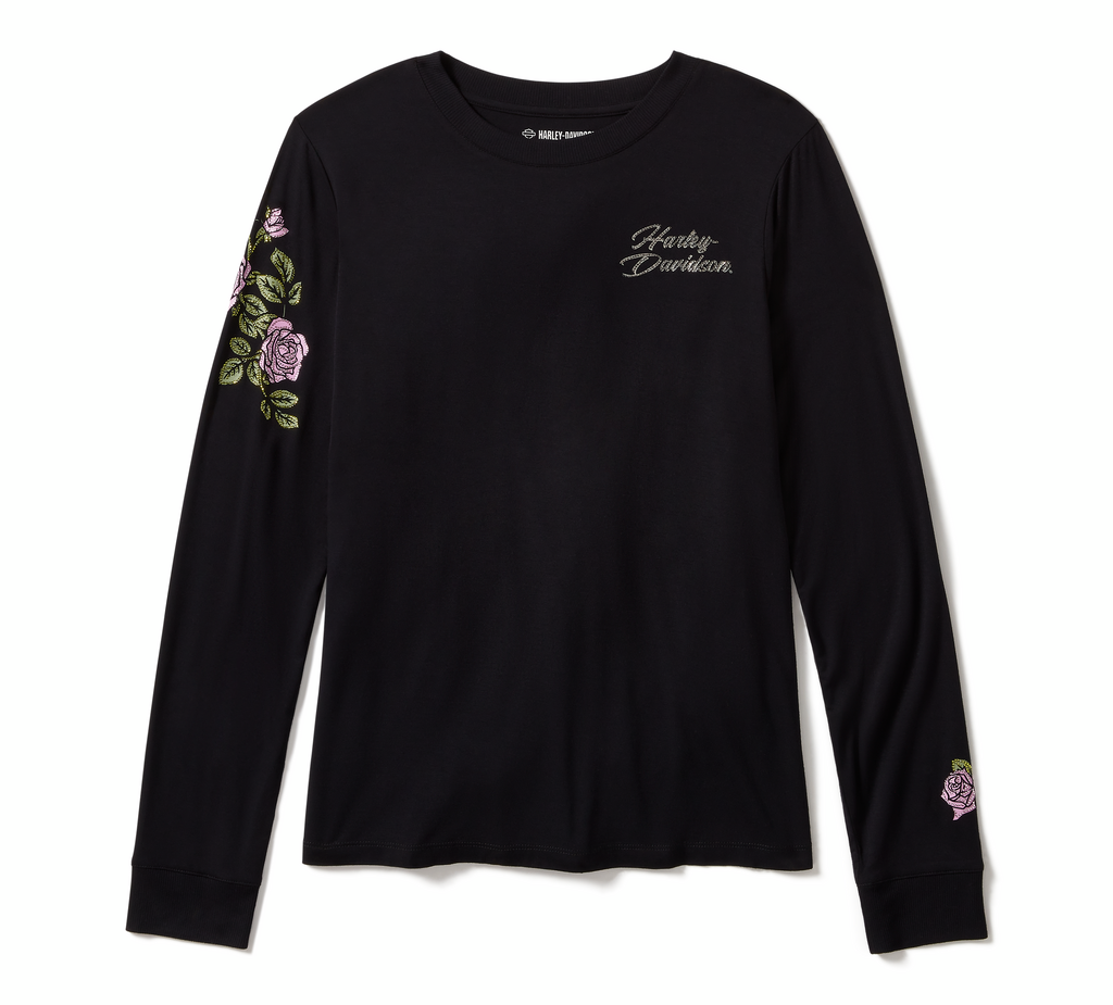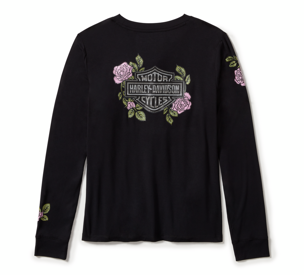 H-D style is in full bloom on our limited-issue Rose & Thorn Bling Long Sleeve Top. Cut from rayon jersey with a hit of spandex for a smooth silky feel that’s wrinkle-free, so it’s a must-pack item in your saddlebag or suitcase. Attractively finished with embellished graphics that fuse our moto legacy with distinctive floral designs. Get yours now before they’re gone.