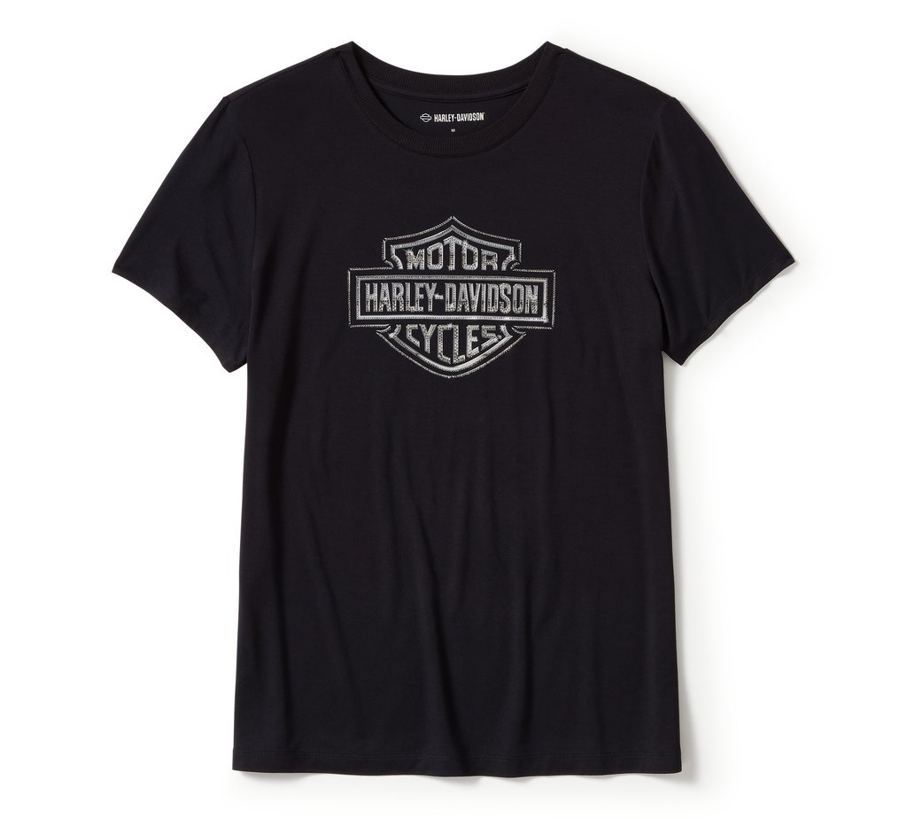 Add some moto-inspired sparkle to your casual look with our Essential Bling Crew Neck Tee. Its rayon/spandex jersey build is breathable, soft, and wrinkle-free (so it travels well in your saddlebag or suitcase). The embellished version of our most beloved graphics on this women’s t-shirt transforms it from standard into stunning.