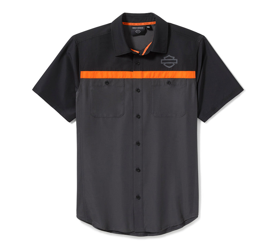 Keeping your cool is effortless in our H-D® TECH Vented Shirt. Its polyester ripstop and mesh build wicks moisture and dries quickly, while its vibrant, contrasting style and graphics deliver a more modern H-D look. This men’s short sleeve button down features a shirttail hem that looks great tucked in or out, a handy pen stall on the left chest pocket, and a hidden snap-down collar that doesn’t flap around under riding gear.