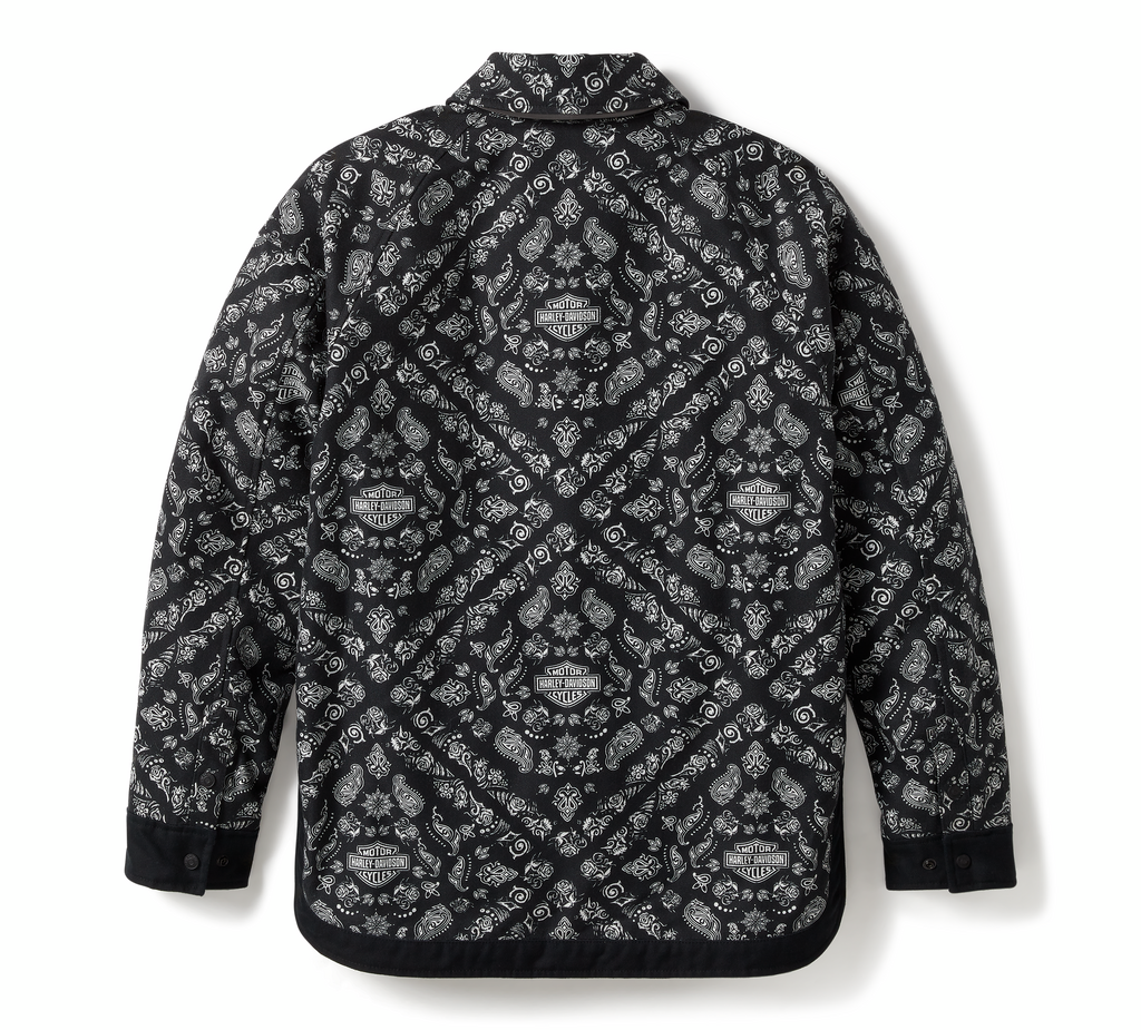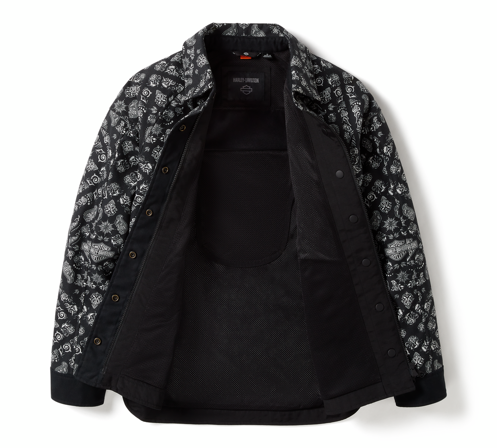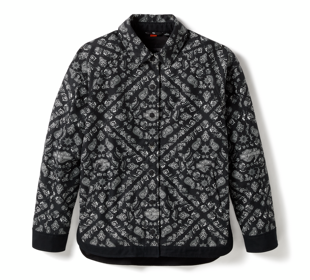 There’s literally more to love about our latest Operative offering. It’s still wisely built from heavyweight cotton/poly twill, but this H-D® Operative Smock Riding Shirt Jacket is now in an oversized fit. It has underarm venting and reflective material to enhance visibility, plus a hidden snap-down collar that stays in place during rides. It’s equipped with impact protection from our D3O® Ghost™ armor at the shoulders and elbows, and has a zippered right stash pocket to secure your essentials. This women’s motorcycle shirt jacket is also tested and certified to meet abrasion, tear, and seam strength requirements. Its styled with a custom bandana-inspired pattern infused with our branding for a distinctive H-D look. Get familiar with the specs below, then order yours ASAP.