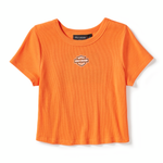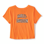 Stay-true Harley style is here on the Essential Arched Font Babydoll Tee. Its silhouette hits right at your natural waistline and is made from a ribbed cotton/modal/spandex blend for longwearing, lightweight comfort in a textured look (zoom in to see). Our most notable Bar & Shield graces the front while our arched branding fills the back. In fact, this arched look resembles what appeared on our 1930s racing apparel.