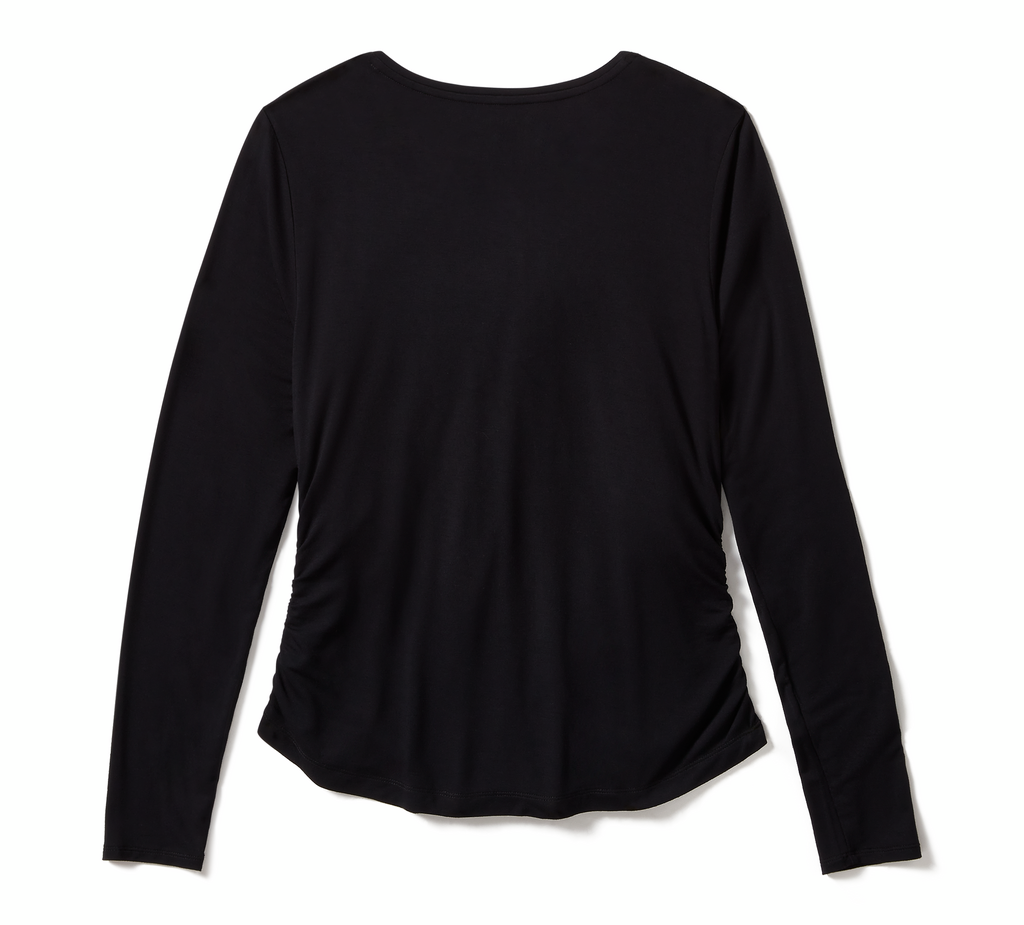 • Design Details: Slim fit. Self neck trim. Crew neckline. Side ruching. Shirttail hem.