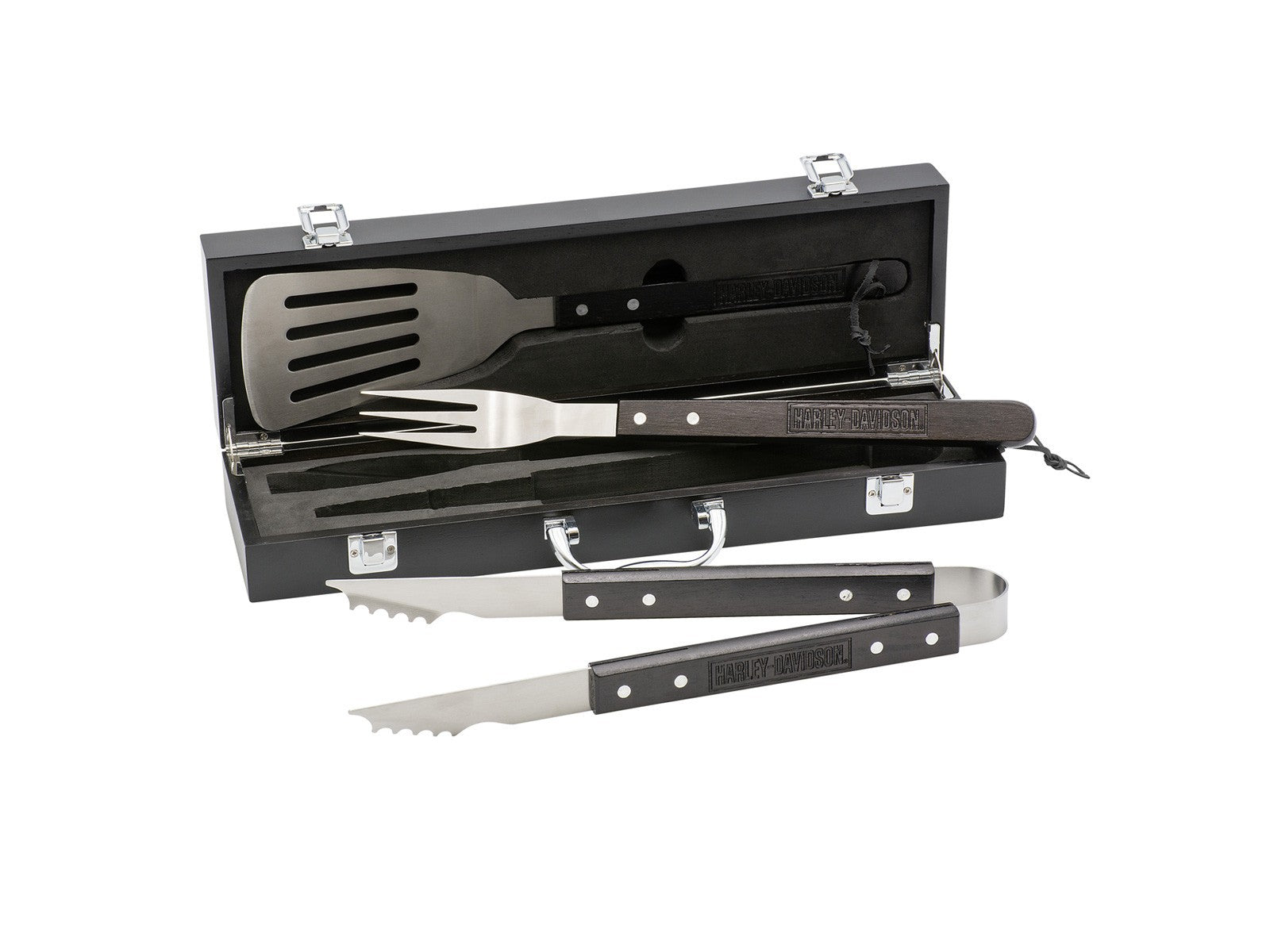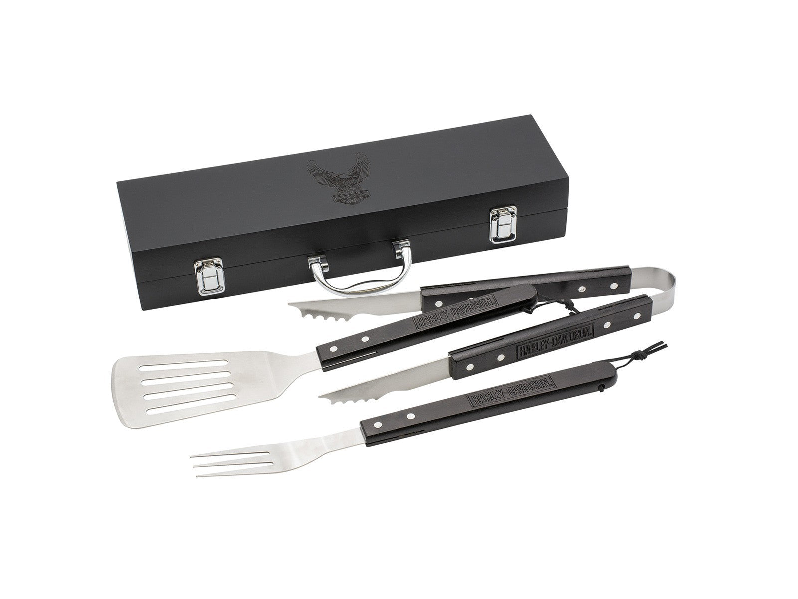 Harley-Davidson® B&S Eagle Grill Tool Set, HDX-99335. Attractive grill tool set with custom black wood case features engraved Bar & Shield Eagle on case and Harley-Davidson® on the handles. Set includes: Case, Fork, Spatula and Tongs. Dimensions: 17" L x 4.75" W x 2.75" H. Set includes: Case, Fork, Spatula and Tongs