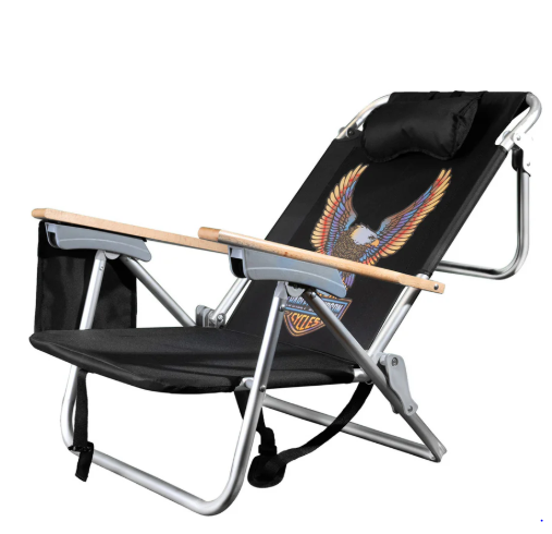 Harley-Davidson® Beach Chair, HDX-99329. Adjustable powder-coated steel tube frame with wooden handles and cup holders. lack 600 Denier polyester. Features Vivid Bar & Shield® Eagle graphic. Backrest pillow. Carry strap for easy transport. Folded measures approximately 24"W x 27"H x 5"D; while open measures approximately 25"W x 31"H x 20"D. Featuring a sturdy and adjustable steel frame with wooden handles and cup holders for maximum comfort and convenience. The black 600 Denier polyester material is both durable and stylish, adorned with the iconic Vivid Bar & Shield® Eagle graphic. Relax in style with the added backrest pillow and easily transport your chair with the included carry strap. Whether folded or open, this chair is the perfect addition to any beach day.