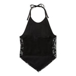 • Design Details: Slim fit. Halter neckline with tied straps. Bust darts. Back smocking with elastic. Handkerchief hem front, cropped back. Custom allover front pattern.